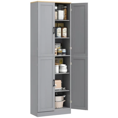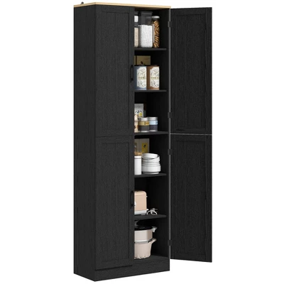 - Upgrade Your Storage: The 6-tier shelving of this kitchen cupboard gives you plenty of room for dishes, cookbooks, pots and pans, dry goods, or plastic containers. Keep organized behind the four doors, so your items stay safe and dust-free. The two adjustable shelves can be customized to fit pitchers and pasta containers if you have taller items.