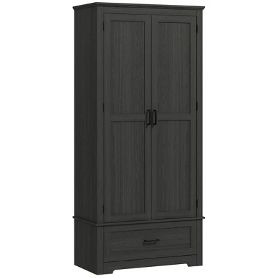 Discover the charm and functionality of a HOMCOM tall kitchen cabinet. With 4-tiers of shelves and a drawer, this kitchen pantry cabinet offers ample space for all your essentials. Adjust the shelves to fit your needs and enjoy the farmhouse flair of the wood grain surface with black handles. Safety is made a priority with its anti-tipping design. Safe, strong and stylish it is a must-have for any home.