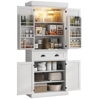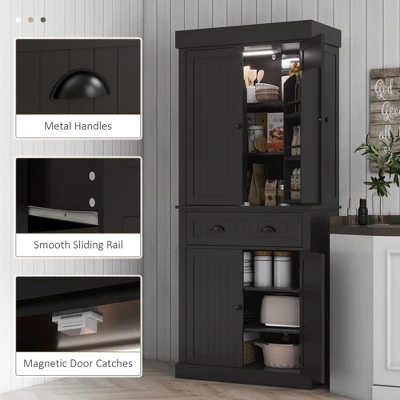 Light up your kitchen organization with the HOMCOM storage cabinet with doors and shelves! Featuring adjustable LED lights with motion and light sensors, this tall cabinet offers customizable illumination. Enjoy ample storage with a drawer, four adjustable shelves, and six side door shelves, all secured with magnetic locks for seamless access. Transform your kitchen storage into a well-lit, functional space!