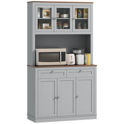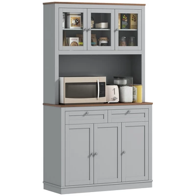 Maximize your space with the HOMCOM food pantry cabinet, designed with eight compartments, two drawers, and adjustable shelves to neatly organize dishes to silverware. The stylish glass doors and metal knobs enhance any area, from kitchens to entryways, ensuring elegance and functionality. Enhanced with a safety anti-tip feature for added security.
