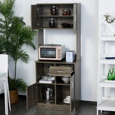 Creating a stylish storage cabinet option has never been so easy! This rustic microwave cabinet with storage and drawers from HOMCOM can be used in the kitchen, dining room, living room, or study for added storage. This kitchen pantry comes with 3 door cabinets, a storage cube, and a pull-out drawer for kitchen utensils and plates. With its compact design and great storage capabilities, the kitchen buffet will give you perfect usage experience.