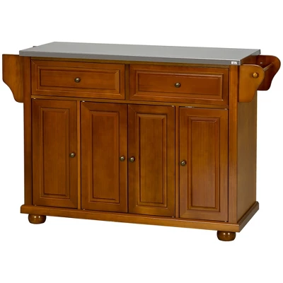 Add extra storage to your home with triple cabinets, a large two small, and a pair of wide drawers in this HOMCOM kitchen island table. It features a stainless steel top for prepping meals and ease of pot and pan placement after taking the food off the heat. The drawers and shelves can be used for pantry purposes or dish storage. A spice rack and two towel racks on the sides of the butcher block island enhance convenience. Make your house a home with HOMCOM.