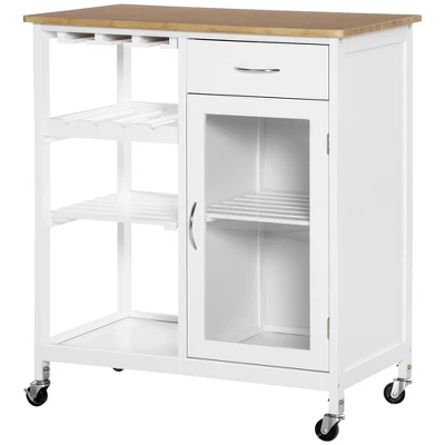 Organize your kitchen with this stylish rolling drink cart from HOMCOM. The frame, made from MDF, is stable and reliable for everyday use and is made into a design that features ample multi-functional space for different storage applications. Its space-saving design is also wonderful for small areas. A compact and functional kitchen cart is a must-have companion in your home.